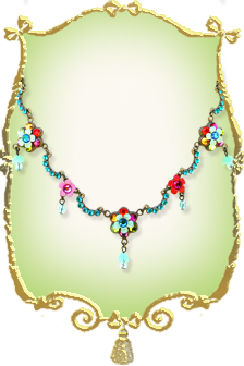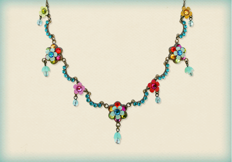 Description: Reminding one of waves and ocean, this necklace is a sweet mix of texture, shapes and stones. The wavy look is created by the mini arches formed by the row of beautiful stones. Pretty flowers in two sizes adorn the joints in between the wave arches. The smaller flowers are comprised of muted petals and rhinestone centers. The larger flower is a combination of the small flowers layered with multi color flowers and adds a new dimension to the design. Hanging beads and bells adorn the necklace to complete the finished look.